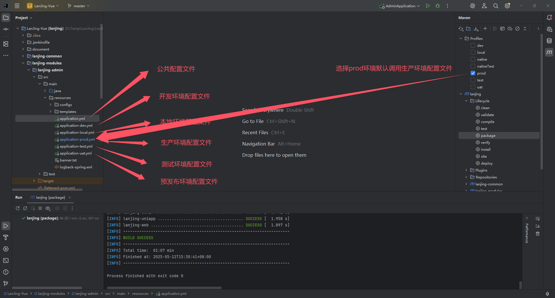 本项目的启动模块是 lanjing-modules/lanjing-admin 模块,在模块的 POM 文件中定义了支持多种环境变量,包括 local、dev、test、uat、prod 等环境参数和变量。